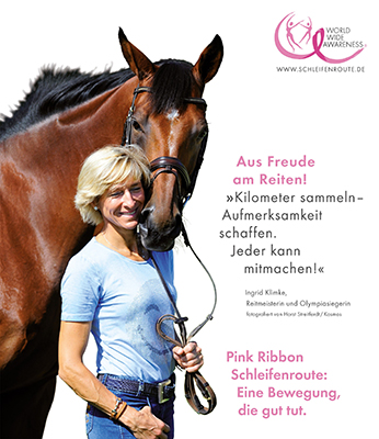 As of 2017, I am the ambassador of the “Ribbon route” for Pink Ribbon. The Pink Ribbon is an unmistakable symbol for bringing awareness to breast cancer and its early detection. I want to help reach as many girls and women as possible. Taking care of my health and taking precautionary measures is very important to me. My mother passed this awareness on to me, and it is also something I will pass on to my daughters. And especially in a disease such as breast cancer, early detection is very important. Early detection is, in most cases, the basis for a possible cure. A crucial factor in reducing cancer risk is regular exercise. It is especially fun to be active, whether alone or with family and friends outside in nature. The “ribbon route” from Pink Ribbon gives you great route recommendations and covers approximately 4500 km in Germany and Switzerland. Whether on foot, by bike, or on horseback, every kilometre travelled on the route can be “donated” on the website. Join us and show your support!