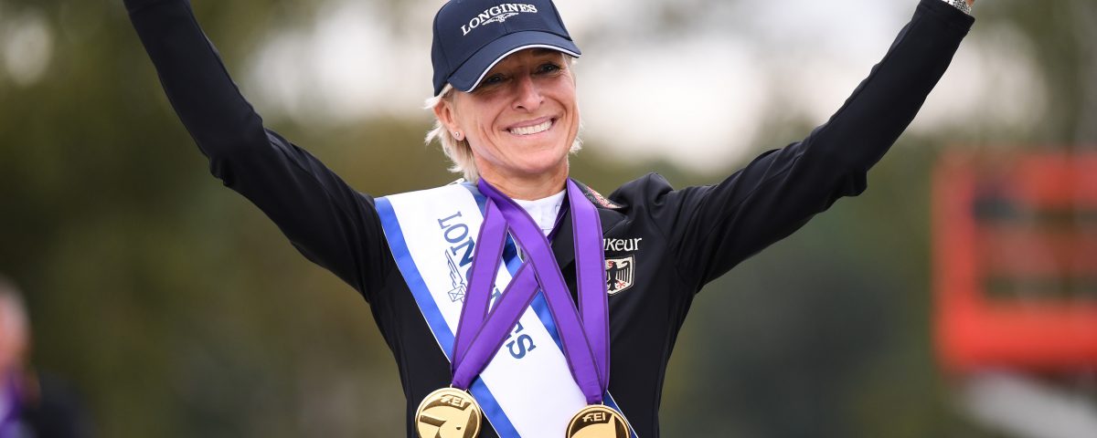 9. Juni 2020LUHMUHLEN, GERMANY - SEPTEMBER 01: Ingrid Klimke of Germany celebrate with her two gold medals for team competion and single ride after Day 5 of the Show Jumping at the Longines FEI Eventing European Championships 2019 on September 01, 2019 in Luhmuhlen, Germany. (Photo by Oliver Hardt/Getty Images for FEI)