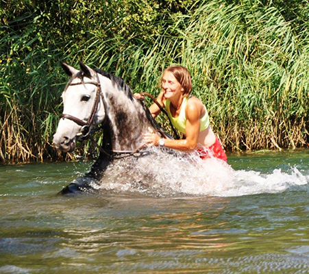 Hans Melzer saw the grey mare in 2014 being ridden cross country by Marina Köhnke and suggested her to me. Her new name “Weisse Düne“ ( White Dunes) came from Norderney ( an island off the North Sea of Germany) . That is where we got to know her and fell under her spell. Her stable name is “Biene” and she was bred by Hanno Köhncke.